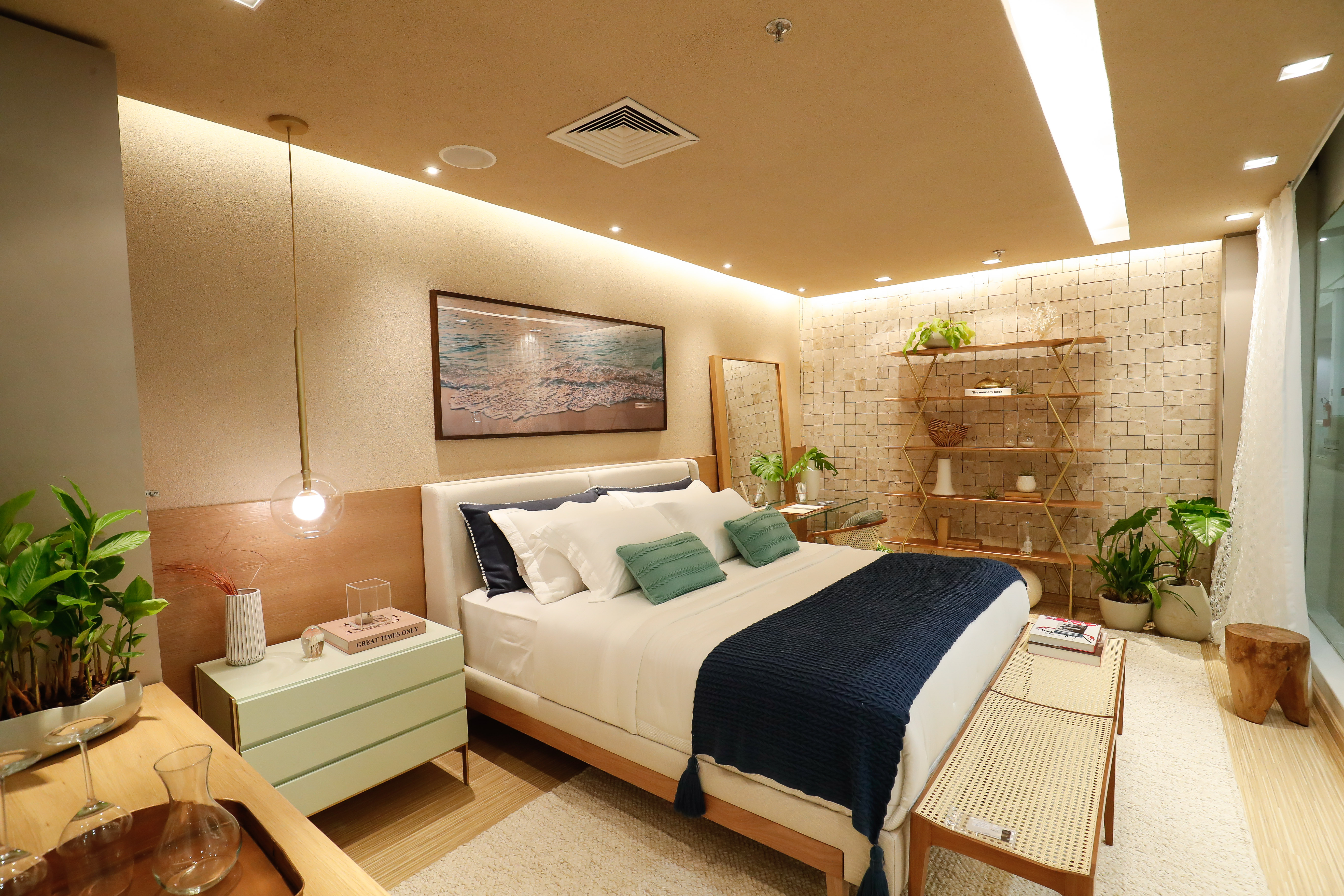 A estreia do Studio Treevo - o mais novo escritório de arquitetura e interiores da cidade - em uma grande mostra, conta com um parceiro de peso: a Marmoraria Multipedras, responsável por painel de paginação irregular e beleza única, que ocupa parede da Suíte Descontecte-se, espaço assinado pelo trio Tanara Góis, Vanessa Testoni e Lorena Lima, com colab de Nicholas Flaschmaan.